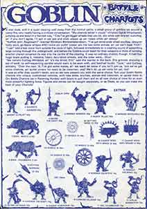 This box contains two complete two-wolf chariots, with charioteers and a selection of three Goblin personality figures. One personality rides in each chariot, and a slottabase is provided for the remaining model. These multi-part kits, designed by Kevin "Goblinmaster" Adams, are ideal for use with Warhammer and Warhammer Fantasy Role-Play.