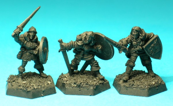 This set of three figures represents a human female Fighter player character at different stages of career progression, from novice warrior to powerful, magic-wielding warrioress.