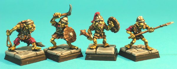 This set of figures represent Goblins, evil denizens of dark, haunted forests and the upper levels of dungeon complexes. Four different poses were made; a spearman, a goblin armed with a sling and dagger, a club-armed leader and one armed with a hand-pick. It seems likely that 5 variants of each pose were produced, with differences only seen in head and face detail.