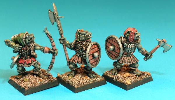 This set of figures represents a trio of Gnolls, brutal hyena-headed humanoids renowned for their cruel natures. The set of 3 figures comprised an archer firing a greatbow, a gnoll warrior armed with a variety of polearms (Gary Gygax must surely have approved of these!), and a Gnoll armed with a handaxe and shield. It seems likely that 5 variant figures were made of the archer and polearm poses, but only 4 of the hand-weapon variant, with the variations in head and facial features as well as the polearm- and axe-heads. It is uncertain why an uneven number of variants were made, but it is possible that the 5th hand-weapon variant was damaged during the mould-making process, and simply discarded.
